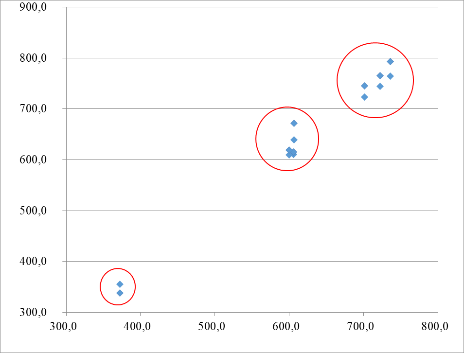 По результатам отчетливо видно, что мы имеем три группы значений, от 600 до 700 тыс. чел., от 700 до 800 тыс. чел. и от 300 до 400 тыс. чел. (рис.1).