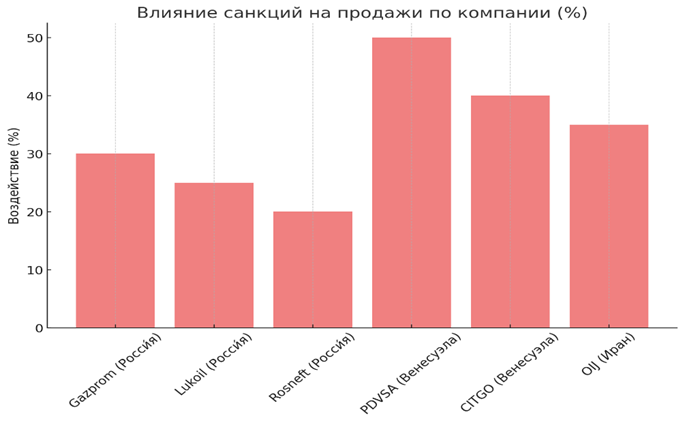Влияние санкций на продажи по компаниям (%): эта диаграмма показывает, как санкции повлияли на продажи каждой компании.