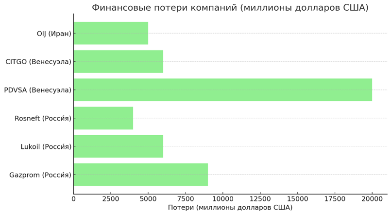 Описание: На этой горизонтальной диаграмме показаны ежегодные финансовые убытки каждой компании, на которую распространяются санкции, исчисляемые миллионами долларов. Наибольший убыток оценивается PDVSA в 20 миллиардов долларов, за ней следует Газпром с убытком в 9 миллиардов долларов. Эти статистические данные показывают серьезность финансовых последствий санкций, особенно в тех областях, где для их реализации требуются иностранная помощь и технологии.
