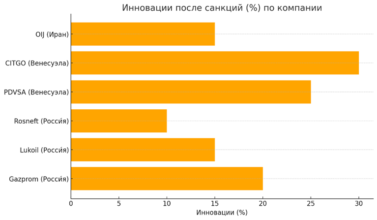 Финансовые трудности, с которыми сталкиваются компании, очевидны из-за предполагаемых убытков, которые составляют от 4 до 20 миллиардов долларов. Это подтверждается исследованиями, показывающими, что финансовая нестабильность, вызванная санкциями, оказывает негативное влияние на инвестиционный климат в инновационном секторе [13]. Несмотря на эти препятствия, уровень инноваций в таких компаниях, как CITGO (30%) и PDVSA (25%), высок, что говорит о том, что компании иногда могут менять свою стратегию и искать альтернативные решения. В литературе утверждается, что принудительные инновации могут возникать в ответ на внешние факторы, что позволяет компаниям исследовать новые рыночные возможности и совершенствовать свои процессы [17].