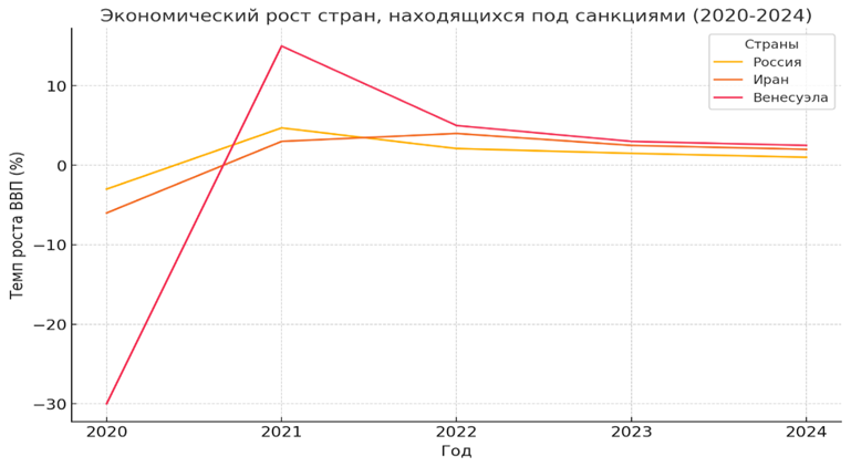 Экономический рост стран, находящихся под санкциями (2023/2024): показывает процент экономического роста в странах, находящихся под санкциями, включая Россию, Венесуэлу и Иран.