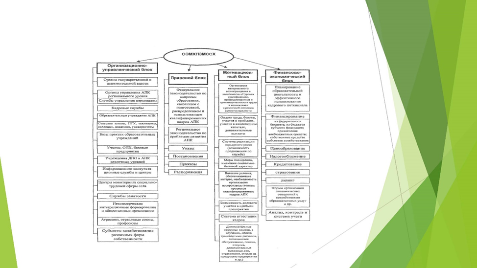 Для решения такого рода проблем и, в первую очередь, связанных с закрепляемостью молодых специалистов и квалифицированных кадров, был предложен четырехблочный, многокомпонентный организационно-экономический механизм, вбирающий в себя организационно-управленческий блок, правовой, мотивационный и финансово-экономический. Такой механизм служит для запуска и реализации целевых комплексных программ кадрового обеспечения АПК (рисунок 3).