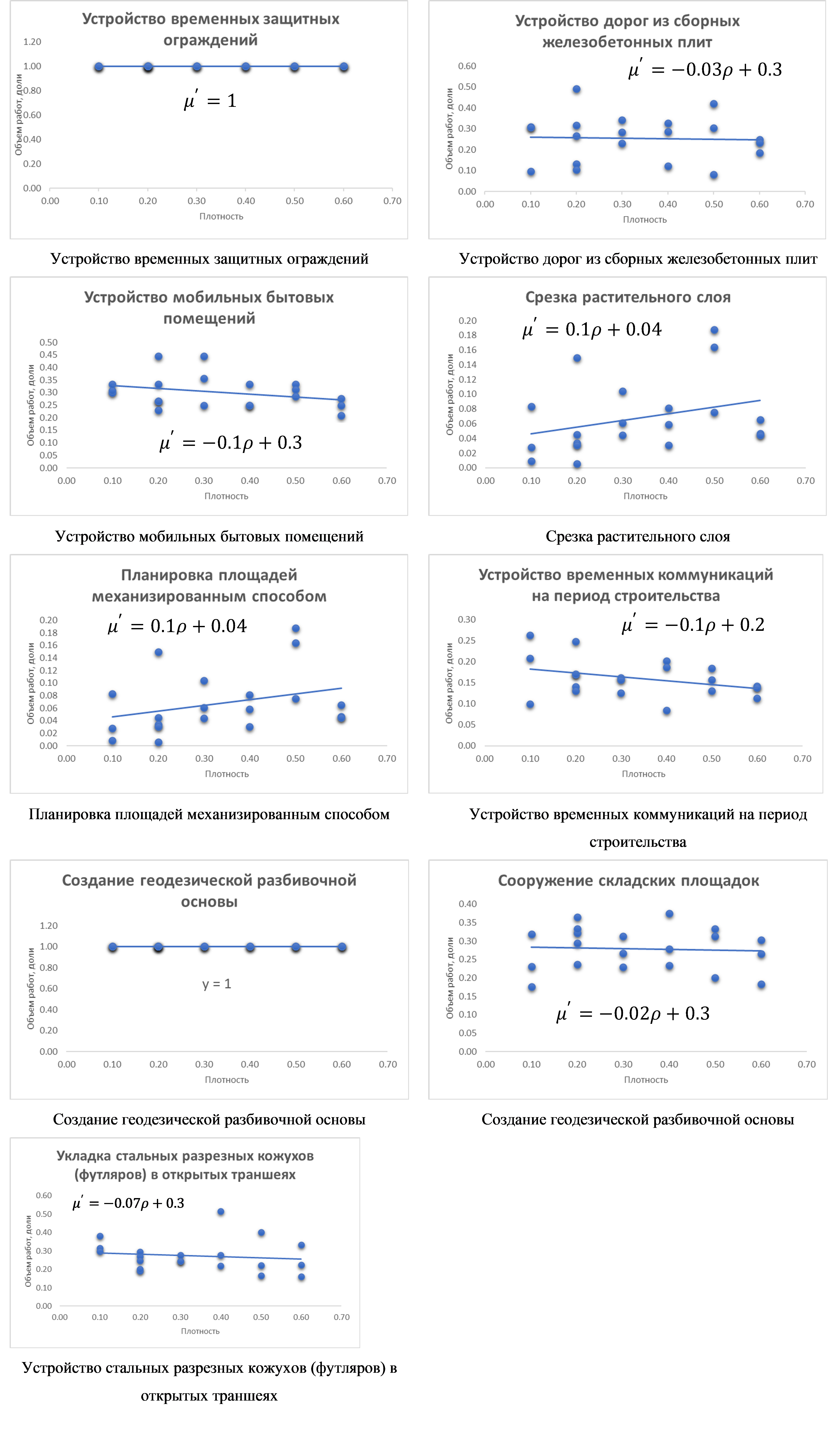 Таким образом, статистическое моделирование и последующая математическая обработка данных методом наименьших квадратов были получены уравнения линейной регрессии, описывающие зависимости доли работ, обязательные к выполнению до начала основного периода μ' от коэффициента плотности застройки ρ  для каждого вида подготовительных работ (рис. 1).