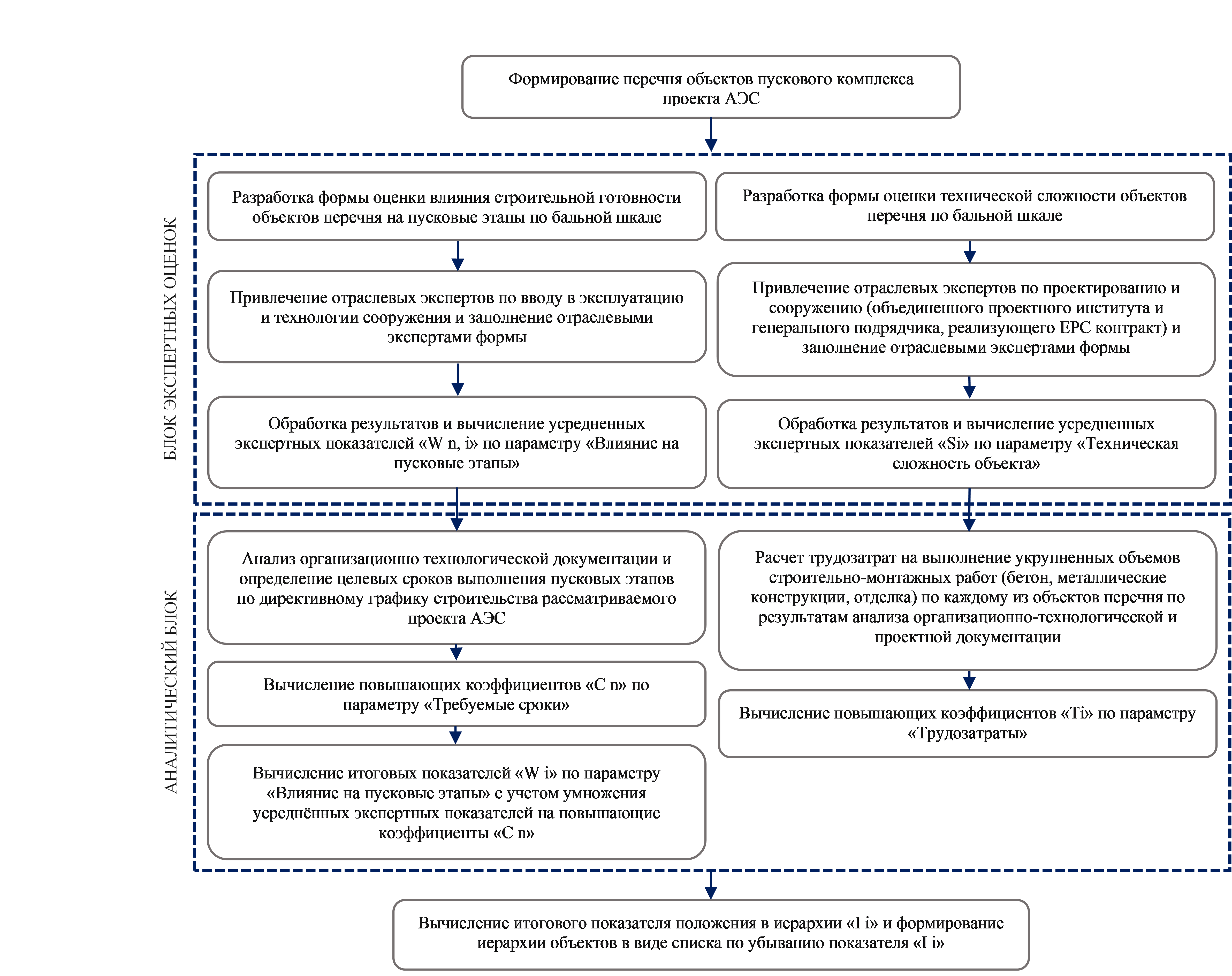 В рамках исследования была поставлена задача разработки экспертно-аналитической модели, позволяющей с использованием технологического и квалификационного потенциала [3,4] широкого круга специалистов в области атомного энергетического строительства сформировать организационно-технологической иерархию объектов АЭС по критерию их влияния на пусковые этапы (в соответствии с СТО 1.1.1.03.003.0880-2017 «Ввод в эксплуатацию блоков атомных станций с водо-водяными энергетическими реакторами. Объем и последовательность пусконаладочных работ. Общие положения»), учитывая при этом трудоемкость, требуемые сроки и техническую сложность возведения данных объектов.
