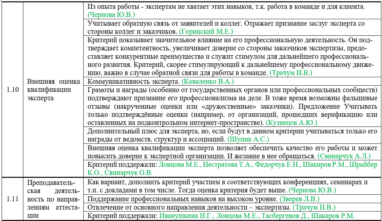 Отбор критериев осуществлялся рабочей группой из 38 представителей 22 организаций – членов Ассоциации экспертиз России и приглашённых специалистов. В основе лежали принципы научной валидации экспертных суждений и доказательной верификации, реализованные через метод Дельфи (ручной экспертной ревизии) [6], при котором исходные данные проходят многоуровневый коллективный анализ и согласование аргументированных позиций. Базой послужили 416 критериев, полученных из 25 опросных листов членов рабочей группы, каждый из которых содержал обоснования, аргументы и комментарии по необходимости включения конкретного критерия. На рисунке 1 приведен фрагмент сводной таблицы с 2 из 416 предложенных критериев.