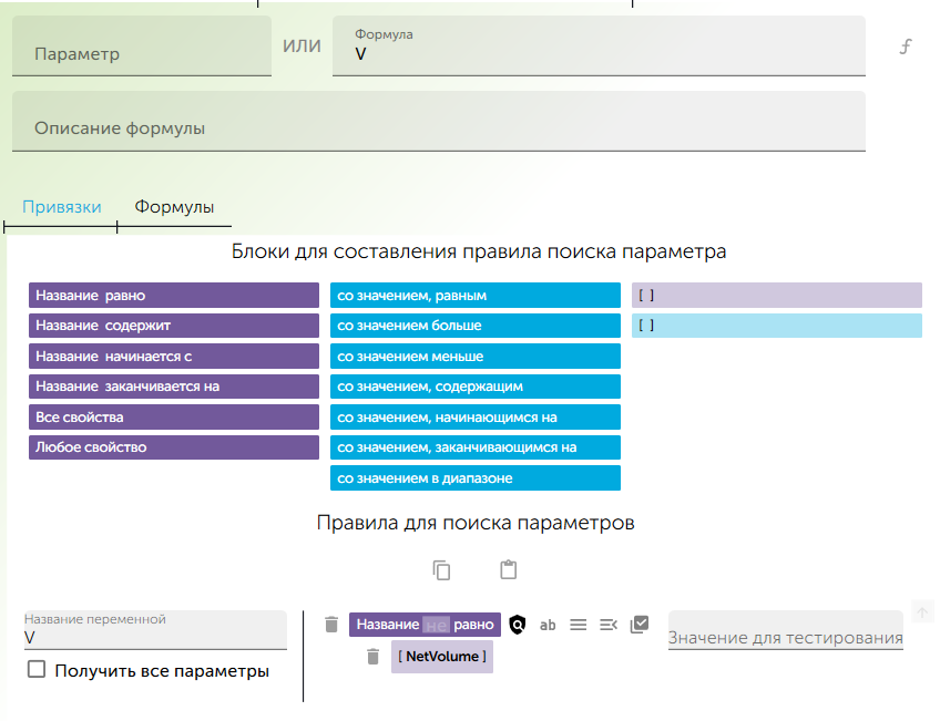 Настройка выбора параметра, участвующего в расчете количественного показателя выполняется на вкладке "Объем позиций". В ней есть возможность прописать переменную, по которой рассчитывается формула, саму формулу и описание формулы. (Рисунок 4). На рисунке 4 представлен пример использования параметра «NetVolume» при расчете объемов.