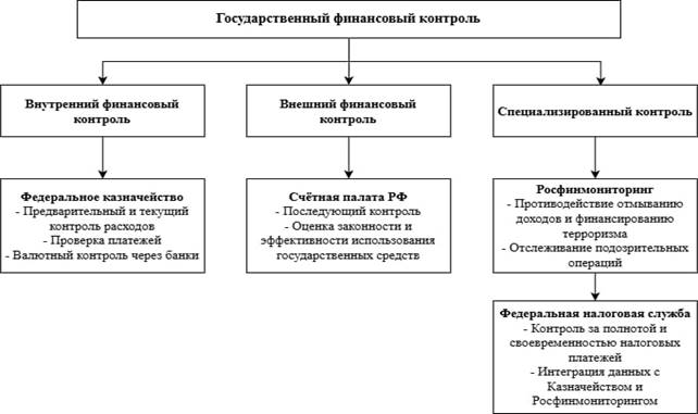 Федеральное казначейство — центральный орган внутреннего государственного финансового контроля. Казначейство осуществляет санкционирование расходов, проверяет соответствие платежей лимитам бюджетных обязательств и наличию подтверждающих документов, обеспечивая непрерывность и превентивность контроля на всех этапах исполнения государственного бюджета. В рамках реализации полномочий по валютному контролю Казначейство обеспечивает соблюдение валютного законодательства, используя систему взаимодействия с уполномоченными банками, что создает дополнительный контур финансовой безопасности государства.