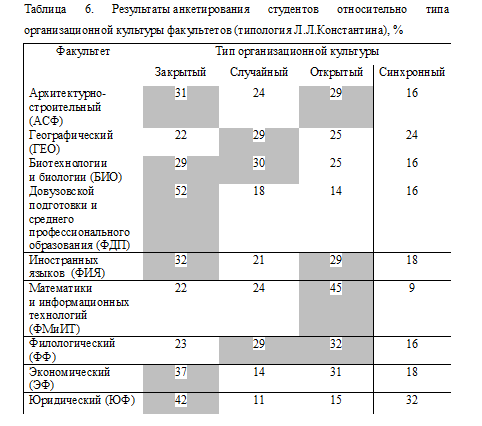 Установлено, что на некоторых факультетах существует симбиоз различных типов организационной культуры. Так, несмотря на некоторое преобладание одного из типов, выявлено, что на архитектурно-строительном факультете и факультете иностранных языков практически равное влияние имеют закрытый и открытый типы, на факультете биотехнологии и биологии – закрытый и случайный, на филологическом факультете – открытый и случайный. На наш взгляд, это можно объяснить присутствием студентов в различных малых объединениях и коллективах в рамках студенческой среды факультета.
