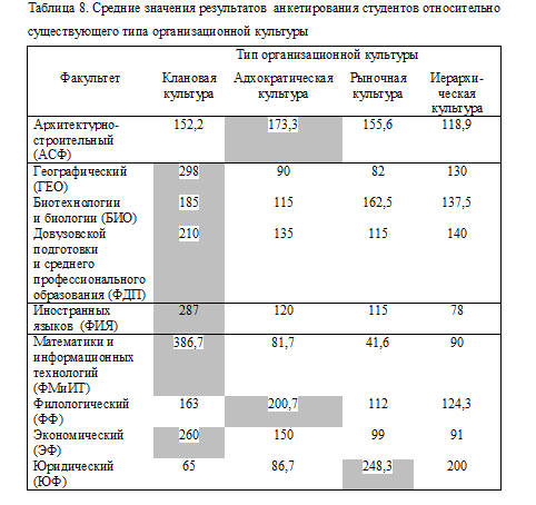 Для филологического и архитектурно-строительного факультетов свойствен адхократический тип организационный культуры. Это значит, что студенты воспринимают свой факультет как динамичное и творческое место, суть которого состоит в преданности экспериментированию и новаторству. Поощряется личная инициатива и свобода. По мнению студентов юридического факультета, преобладает рыночная культура. Главная её характеристика – ориентированность на результат и выполнение поставленной задачи. Представители факультета – целеустремленные люди, соперничающие между собой. Лидеры – требовательные руководители с твердыми взглядами. Факультет связывает воедино стремление побеждать.