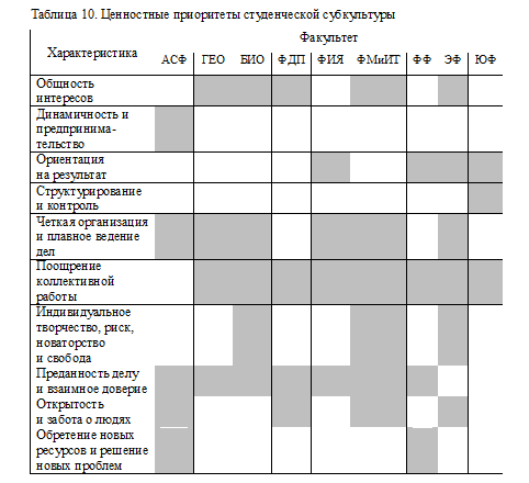 На основе профилей отдельных измерений, выделенных К.Камероном и Р.Куином, была построена обобщенная схема существующих ценностных приоритетов студенческой субкультуры факультетов (табл. 10).
