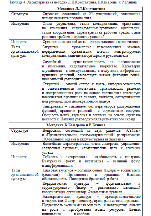 В настоящее время наиболее востребованы эмпирические методы исследования организационной культуры [7]. К наиболее популярным относятся метод Л.Л.Константина, базирующийся на опроснике «Шкала организационных парадигм», а также метод построения профиля организационной культуры, предложенный К. Камероном и Р. Куинном (метод OCAI, Organizational Culture Assessment Instrument) (табл. 4).