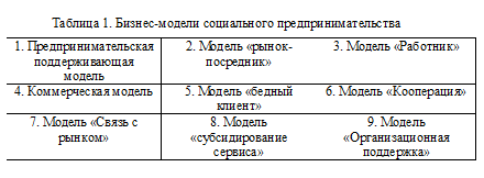 В зависимости от типа интеграции между социальными программами и коммерческой составляющей бизнеса можно выделить: тесно интегрируемые социальные проекты в коммерческую деятельность компаний (например, образовательная деятельность вузов и система воспитательного процесса, связанная с реализацией социальных инициатив); слабо интегрируемые (например, ОАО «Газпром» реализует совокупность социальных проектов, объединенных названием «Помощь детям»); социальные программы, вытекающие из основной бизнес-деятельности (например, магазин игрушек реализует акцию «Помоги собраться в школу»). В зависимости от целевого рынка, на котором функционирует социальное предприятие, можно выделить пять типов: ориентированных на целевую аудиторию (клиентов основного бизнеса), ориентированных на третьи лица, ориентированных на государство, ориентированных на иные коммерческие компании (партнеров по бизнесу и т.п.), ориентированных на общественность. На этой основе сформулируем основные бизнес-модели социального предпринимательства (табл. 1).