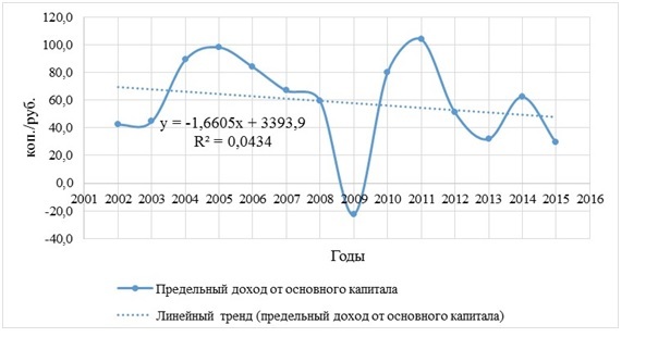 На рис. 3 представлена динамика предельного дохода от основного капитала за период 2002-2015 гг.