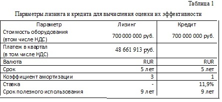 В настоящее время существует актуальная потребность в разработке метода, учитывающего необходимость применения комплексного подхода к определению эффективности лизинга, специфику налогообложения лизинговых операций в Российской Федерации, возможность влияния стохастических факторов на экономическую эффективность лизинга, т.е. интегрального метода оценки экономической эффективности лизингового метода обновления основных фондов промышленности. Существующие в российской практике лизинговой деятельности методы не позволяют промышленным предприятиям проводить комплексную объективную оценку эффективности лизинга. С целью устранить существующие недостатки современных методов оценки экономической эффективности лизинга в процессе обновления основных фондов промышленности мы провели расчет по двум вариантам: с использованием детерминированного метода; с использованием стохастической модели (CIR-модель). Расчет основан на реальном лизинговом контракте и анализе, проведенном для крупного промышленного предприятия Урала. Условия этих вариантов финансирования инвестиционного проекта компании представлены в табл. 1. Детерминированный подход будет заключаться в определении NPV денежных потоков, генерируемых рассматриваемым инструментом с учетом особенностей налогообложения.