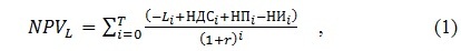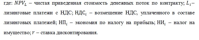 При расчете будут учитываться следующие денежные потоки по лизинговому контракту: лизинговые платежи с НДС; возмещение НДС, уплаченного в составе лизинговых платежей; экономия по налогу на прибыль; налог на имущество. Таким образом, формула расчета оценки эффективности лизинга имеет вид: