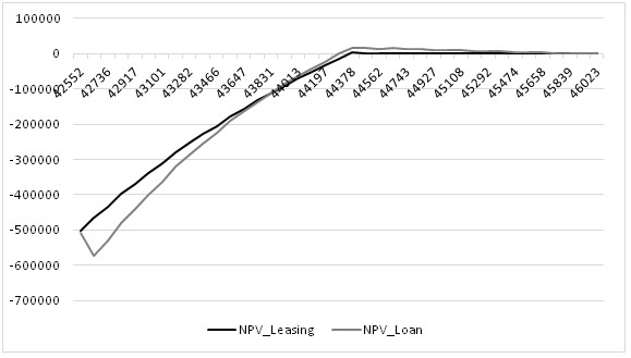 Очевидно, что преимущество лизинга не столь большое, что говорит о неоднозначности результата. Так, при изменении графика платежей по кредиту можно получить иной результат, но мы будем исходить из предоставленных данных, примем, что участники сделки действуют рационально, будем считать кредит оптимальным предложением по замене лизинга. Для интереса рассчитана процентная ставка по кредиту, при которой оба инструмента становятся равнозначными: 11,4925%. Это ставка, при которой NPV проекта при финансировании с использованием лизинга равен NPV проекта при финансировании с использованием кредита.