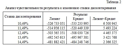 Анализ чувствительности результатов расчетов к изменению ставки дисконтирования приведен в табл. 2. Согласно полученным данным, лишь при увеличении ставки дисконтирования до 16,7082% кредит становится эквивалентен лизингу. Преимущество лизинга перед кредитом при росте ставки дисконтирования обусловлено особенностями возмещения НДС: при покупке за счет кредита НДС возмещается в следующем квартале, а возмещение НДС от лизинговых платежей растянуто во времени.