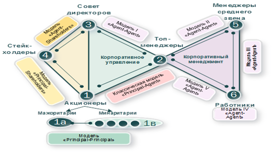 - классическая агентская модель «Principal–Agent» – конфликты между акционерами как принципалами и агентами в виде топ-менеджерами и советом директоров в качестве противовеса управленческому оппортунизму (позиция субъектов №1–2–3);