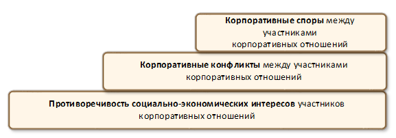 Тем не менее следует отметить, что сама по себе противоречивость и противоположность интересов участников корпоративных отношений является необходимым условием развития корпоративных отношений, и только в динамике с возникновением нового уровня качественной определенности противоречивости интересов и разногласий основных субъектов корпоративных отношений формируется «корпоративный конфликт», который имеет более четкие границы своей реализации и тесно взаимосвязан с понятием «корпоративные споры», отражающим правовую специфику инструментов и методов разрешения корпоративных конфликтов.