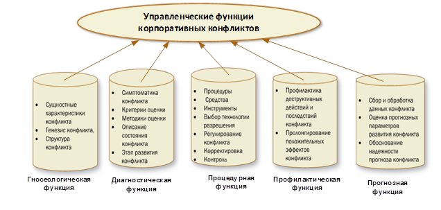 - в–третьих, для управления конфликтными ситуациями в компаниях целесообразно рассматривать следующие управленческие функции корпоративных конфликтов – гносеологическая (познавательная), диагностическая, процедурная, профилактическая, прогнозная, что позволяет обосновать выбор технологии и средств их разрешения для минимизации негативных последствий конфликтных ситуаций на всех стадиях жизненного цикла корпоративных конфликтов (возникновение, развитие, разрешение)