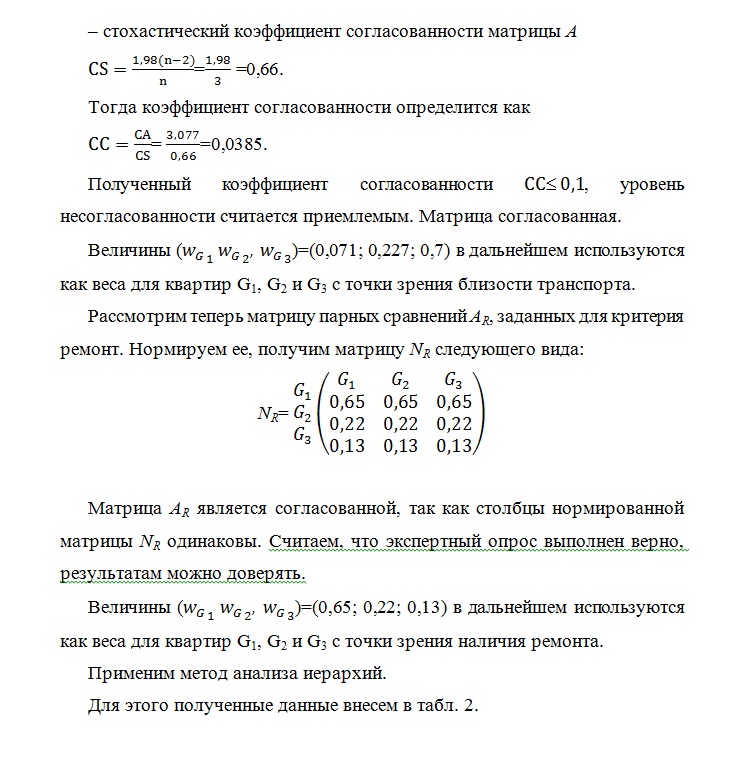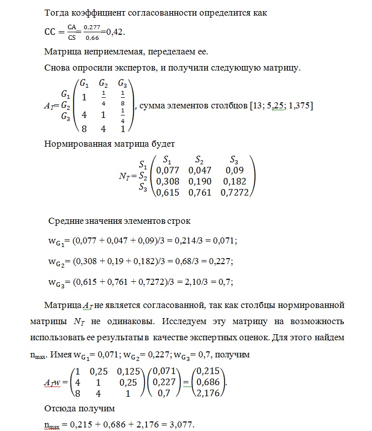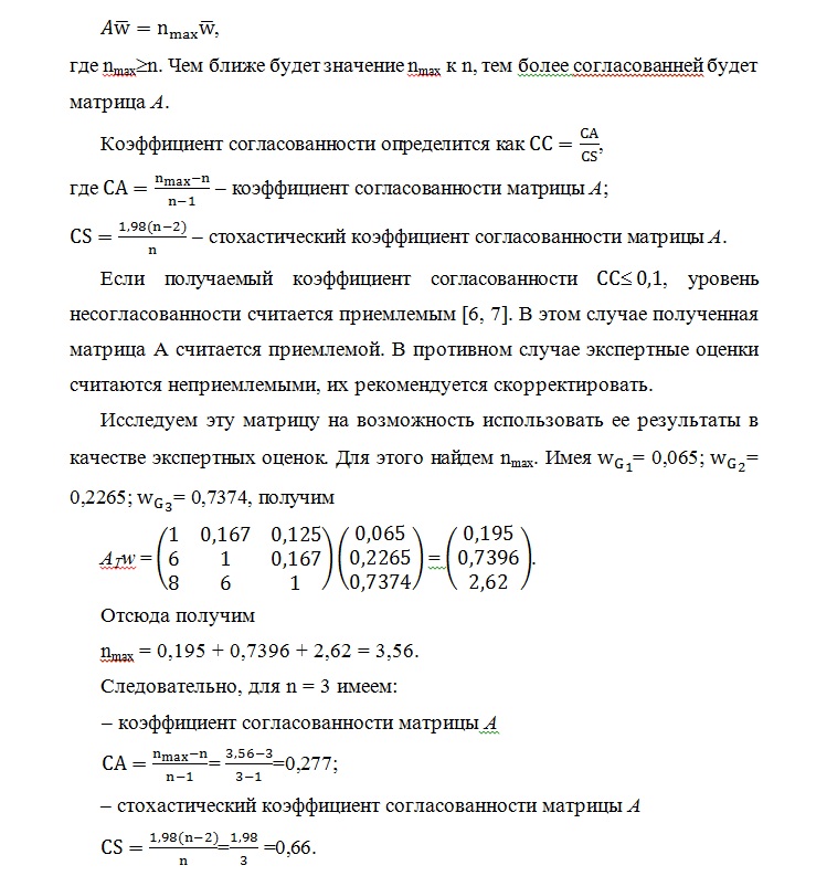 Если матрица является несогласованной, вычисляется коэффициент согласованности для проверки того, можем ли мы воспользоваться результатами экспертного опроса или нет [6, 10].