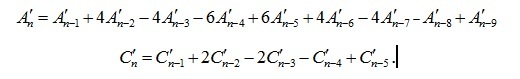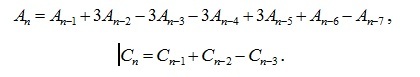 Оператор rgf_findrecur из пакета genfunc системы Maple по этим данным дал рекуррентные уравнения, которым удовлетворяют члены последовательностей: