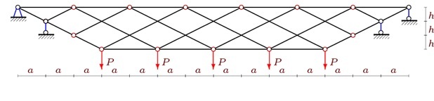Расчет перемещений узлов фермы, необходимый для оценки ее деформативности, обычно выполняют численно в одном из стандартных пакетов. С увеличением числа стержней в ферме увеличивается и размер матрицы уравнений равновесия узлов. Начиная с некоторого значения, любой численный метод начинает давать погрешности, недопустимые, если речь идет о таких ответственных расчетах, как расчеты мостов, покрытий промышленных сооружений, концертных залов, стадионов. Именно в таких сооружениях как правило применяются фермы с большим числом панелей. В работах [1-3] показано, что для многих статически определимых стержневых регулярных (с периодической решеткой) ферм возможно получить формульное решение, свободное от упомянутого "проклятия размерности". Аналитические решения для пространственных [4-10] и плоских ферм [11-19] получены с использованием системы компьютерной математики Maple и метода индукции. В настоящей работе на основе программы [20] для нахождения усилий в стержнях статически определимых фермах и упомянутого метода индукции выводятся формулы для прогиба центрального узла плоской фермы (рис. 1). Ферма с n панелями (считаются по нижнему поясу) содержит m=4n+18 стержней и 2n+9 сочленяющих узлов. Ферма статически определима, однако из трех уравнений равновесия конструкции в целом (как это обычно делается в начале расчета) найти пять реакций не удается. Это связано с тем, что ферма без опор не является жестким телом и имеет две степени свободы. Отсюда неизбежно применения полного расчета фермы вырезанием всех узлов и составление общей системы равновесия.