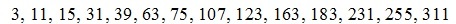 7, 207, 399, 1871, 2811, 7683, 10315, 21771, 27423, 49703, 60087, 98487, 115699, 176571, 203091, 293843, 332535, 461631