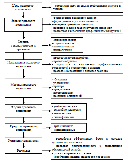 - правовое воспитание военнослужащих ВС РФ представляет целенаправленное, систематическое воздействие на военнослужащих и воинские коллективы с целью формирования у них профессионально значимого правосознания оптимальными методами, формами и средствами обучения, воспитания, саморазвития и привития устойчивых навыков правопослушного поведения;