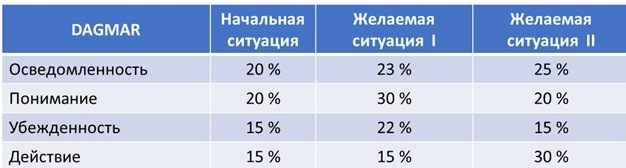 Когда речь идет о продвижении для формирования маркетингового механизма активно используются коммуникативные модели, одной из них является модель DAGMAR (Defining Advertising Goals for Measured Advertising Results), суть которой заключается установлении количественных (измеримых) целей для каждого этапа процесса принятия решения представителем целевой аудитории [6]. Рассмотрим следующий пример применения модели, описанный в таблице 1.