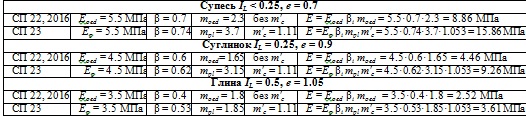 3.4. Корректировка модуля Ек,oed осуществляется введением коэффициентов mk (в СП 22, 2011) или moed (в СП 22,2016) по табл. 2, но коэффициент β при этом не используется.