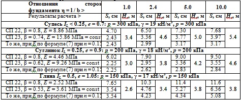 Влияние коэффициентов βi и других факторов (давления р, удельного веса γ и модуля деформации Е) иллюстрирует табл. 6: в ней приведены рассчитанные по нормативам СП 22 и СП 23 осадки фундаментов глубиной заложения d = 2 м, шириной b = 2 м при тех же, что и табл. 1, отношения сторон η.