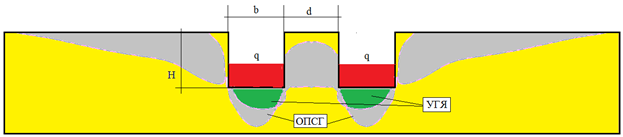 Рис.1. Общий вид расчетной схемы основания периодического заглубленного ленточного фундамента, состоящего из двух элементов, используемые обозначения, области предельного состояния грунта (ОПСГ) и уплотненные грунтовые ядра (УГЯ)