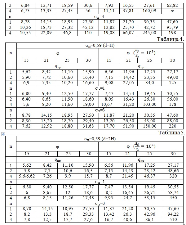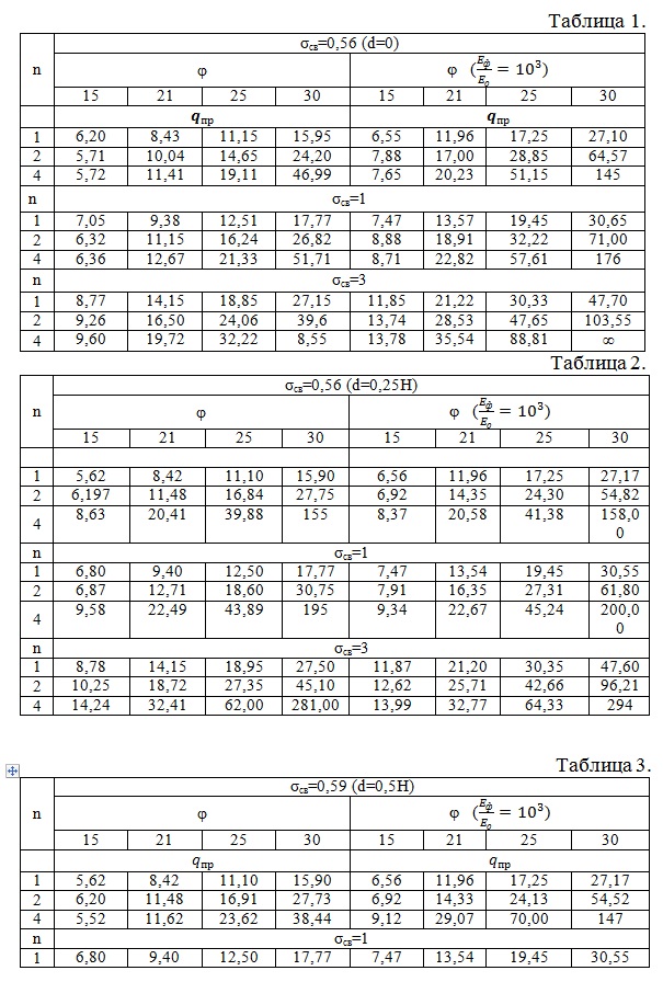 фундаментов, состоящих из одного, двух и четырех элементов, при условии, что b=H, d=0;0,25H;0,5H;H;2H. Основание фундаментов сложено однородным глинистым грунтом; величина коэффициента бокового давления принята равной [7], величина угла внутреннего трения при расчетах принимает значения φ=15о; 21о; 25о; 30о, а величина приведенного давления связности =0,56; 1,0; 3,0. Все просчитано 360 вариантов; результаты расчетов сведены в таблицы № 1-5, приводимые ниже.