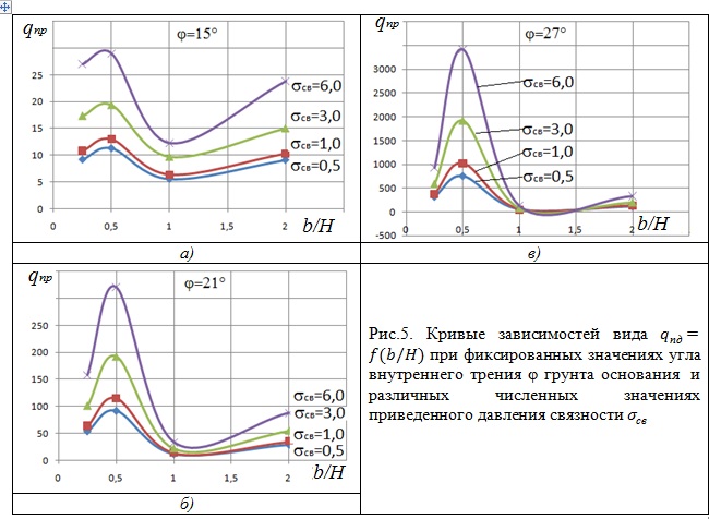 Проведя дополнительные исследования, вопроса о том, как влияет при всех прочих равных условиях расстояние между элементами периодического фундамента на несущую способность основания, построили графические зависимости вида Qpd=f (b\H) при фиксированных значениях угла внутреннего трения φ грунта основания и различных численных значениях приведенного давления связности Q и наоборот. Эти кривые представлены на рис. 5 и 6. Из этих рисунков видно, что при расстоянии межу фундаментами равным примерно половине их глубины заложения, величина предельно допустимой нагрузки на основание «периодического» фундамента становится максимальной. Отметим, что такая закономерность прослеживалась при условии, что ширина элемента фундамента принимала различные значения.