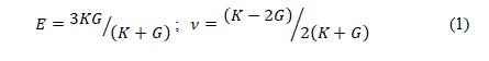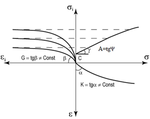– первые инварианты тензоров напряжений и деформаций, соответственно (объемная деформация); i, i – вторые инварианты девиаторных частей тензоров напряжений и деформаций, соответственно (деформация формоизменения-сдвига); K= – модуль объемной деформации; G = – модуль сдвига.