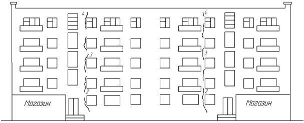 Рис. 6. Дом 48. Трещины стен западного и восточного торцов здания