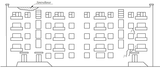 −внешние признаки категории деформаций: повреждение несущих конструкций (в основном распространены волосные трещины на стенах, ряд трещин до 3 ÷ 5 мм, отдельные трещины до 8 ÷ 10 мм).