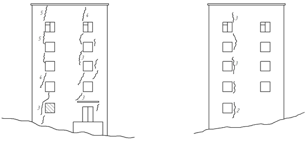 2. Основными причинами появления деформаций в стенах зданий являются неодинаковая сжимаемость грунтов основания, расположение здания на откосе, замачивание грунтов основания, неодинаковая глубина заложения подошвы, фундаментов, динамические воздействия от движения автотранспорта и забивки свай поблизости, наличие дополнительного цокольного этажа на половину дома, наличие подвала под частью дома.