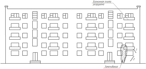 На рис. 1 показаны, трещины главного фасада дома 49. Трещины проходят почти вертикально вблизи лестничных клеток и границ подвала под средней частью здания. Ширина раскрытия трещин до 4 мм. Возможной причиной их образования является наличие подвала под средней частью здания, различная глубина заложения подошвы фундаментов по длине дома, расположение подошв фундаментов в различных грунтовых слоях, замачивание грунтов основания.