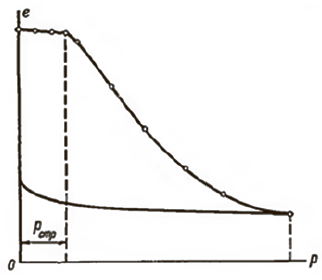 позволяют определить структурную прочность грунта. За структурную прочность принимается такое давление, до которого практически не изменяется начальное значение коэффициента пористости, т.е. объем грунта практически не изменяется. После разрушения структурных связей наблюдаются резкое возрастание деформации и сжатие грунта. Прочность структурных связей зависит от вида глинистого грунта и имеет наибольшее значение в грунтах с кристаллизационными связями [3,4]. В стандарте ASTM определяется не параметр структурной прочности, а эквивалентный ему параметр σр, называемый давлением (напряжением) предварительного уплотнения. Определение этого параметра выполняется различными методами, один из первых был предложен Казагранде.