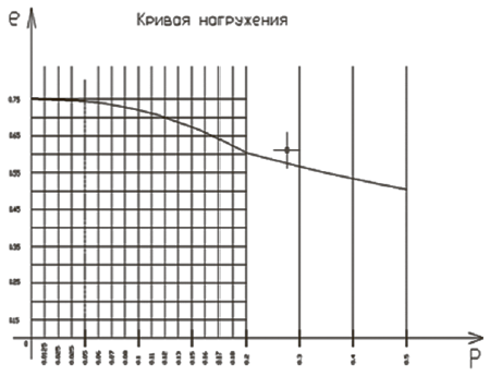 Для определения значения структурной прочности грунта в компрессионном приборе нагружение производилось весьма малыми ступенями нагрузки 0,0125 МПа. Перелом компрессионной кривой свидетельствует о преодолении структурной прочности. По полученным данным строились компрессионные кривые. Компрессионная кривая имеет криволинейное очертание с начальным участком, отличающимся незначительным приращением деформаций с ростом вертикальных давлений. Указанные особенности компрессионных кривых лессовых грунтов отмечались в работах Ю.М. Абелева, Г.И. Швецова, В.И. Осипова. Они обусловлены наличием у лессовых грунтов прочных структурных связей. Пока внешняя нагрузка не превышает прочность структурных связей, деформации грунта незначительны. Как только действующее давление превышает структурную прочность – деформации грунта увеличиваются. На рисунке 3 показана ветвь нагружения компрессионной кривой в координатах коэффициент пористости - давление, полученная ступенями нагружения 0,375 кг/см2 [2].