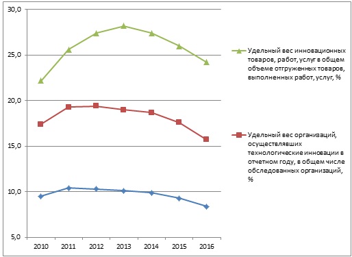 Рис. 1. Показатели инновационного развития Российской Федерации (2010 – 2016 г.г.) [12; 13; 14]
