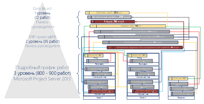 По сути это пирамида в основании которой лежат задачи файлов проектов в Project, здесь мы видим последовательные типовые работы в разрезе этажей и блоков с распределёнными во времени плановыми и фактическими объёмами работ(количество задач в среднем составляет 800 задач), которые сначала попадают на второй уровень структуры а это ГПР и здесь одноимённые задачи объединяются со всех этажей и блоков и их становится около 35, а уже на самом верху или на Dash Board задачи компонуются по принадлежности к конструктивным работам и одинаковыми единицами измерения, и здесь их количество в среднем составляет 12 работ. Но нужно понимать, что в отчётную неделю все 12 задач не отражаются, отражаются только текущие задачи. Нижний уровень — это те самые задачи в MS Project.