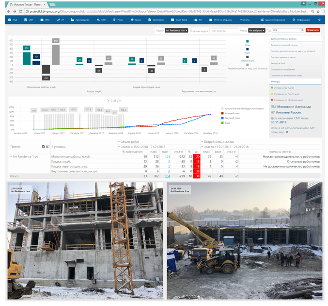 Dash Board состоит из четырёх частей сверху столбиковая диаграмма, которая визуализирует план фактный анализ выполнения объёмов работ за отчётную неделю, затем идёт S-кривая всего проекта, содержащая тренд базового плана, текущего план и тренд факта. Затем табличная часть план-фактного анализа с отражением отставаний в днях с применением светофора и анализ трудовых ресурсов. При наличии отставаний причины этих отставаний. Четвёртая часть — это фотоотчёт (рис. 2). Автоматическая рассылка обеспечивает всех заинтересованных лиц регулярным получением информации о проекте. Тем самым мы лишили всех права на незнание. Благодаря этому отчёту мы имеем еженедельный срез по выполнению работ в %.