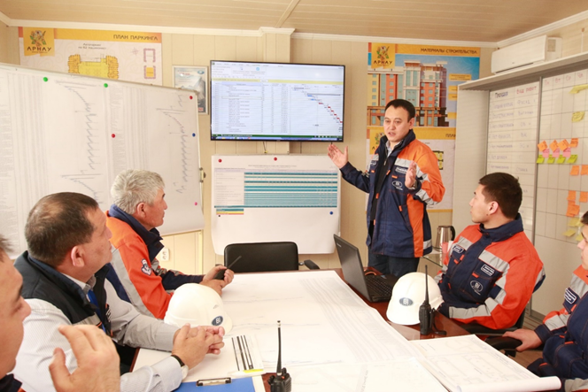 Фото 1. Руководитель портфеля проектов Ентыбаев Естай Ануарбекович, на совещании с командой проекта обсуждает пути оптимизации длительности работ.