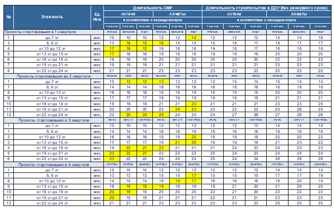Сегодня на Project сервере компании находится около 120 проектов, в том числе около 60 проектов уже закончены. Несколько ранее мы проанализировали все проекты и выявили закономерность между этажностью и периодом, в котором стартовал проект. Т.е. длительность проектов менялась в тех случаях, когда на холодный период выпадали мокрые процессы, устройство рулонной кровли и благоустройство. Так мы разработали нормативные сроки строительно-монтажных работ в зависимости от времени старта и этажности объектов строительства проекта. (таб. 1):