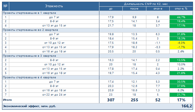 Снижение сроков составило 17 %, или 52 месяца. Применив к этому сэкономленному времени норматив затрат строительного участка, а это 3 млн. 200 тысяч рублей (сюда входит содержание охраны объекта, аренда башенного крана, зарплата ИТР, коммунальные услуги и прочее) мы получаем сумму в 166 млн. рублей за 1,5 года.