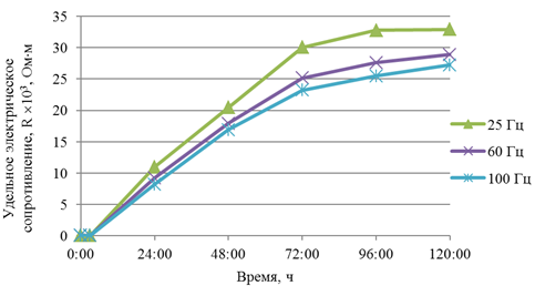 При оценке электропроводности, в качестве параметра контроля за степенью гидратации цемента, были рассмотрены образцы цементной смеси без добавок. Изменение значений удельного электрического сопротивления образца на частотах 25, 60 и 100 Гц представлены на рисунке 2.
