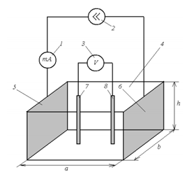 Однако конструктивные особенности прибора не позволяют непрерывно отслеживать изменение значений в процессе набора прочности раствором, вследствие чего были проведены аналогичные исследования на приборе АКАГ, который способен при постоянном токе определять удельное электрическое сопротивление образца размерами (a´b´h) 100´50´45 мм и объемом 0,23 дм3, помещенного в стандартную измерительную ячейку. Схема прибора представлена на рисунке 4.